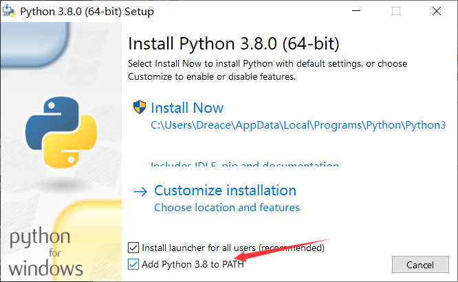 Python 3.8.0 默认安装在 C:\Users\<用户名>\AppData\Local\Programs\Python\Python38 目录,其中 <用户名> 是当前登录的用户名。该目录下有 python.exe 可执行文件,双击可打开 Python 的交互式命令行。如果已经配置环境变量可以在 cmd 中直接使用 python 命令完成上面的操作,或者使用 python --version 命令查看 Python 版本。