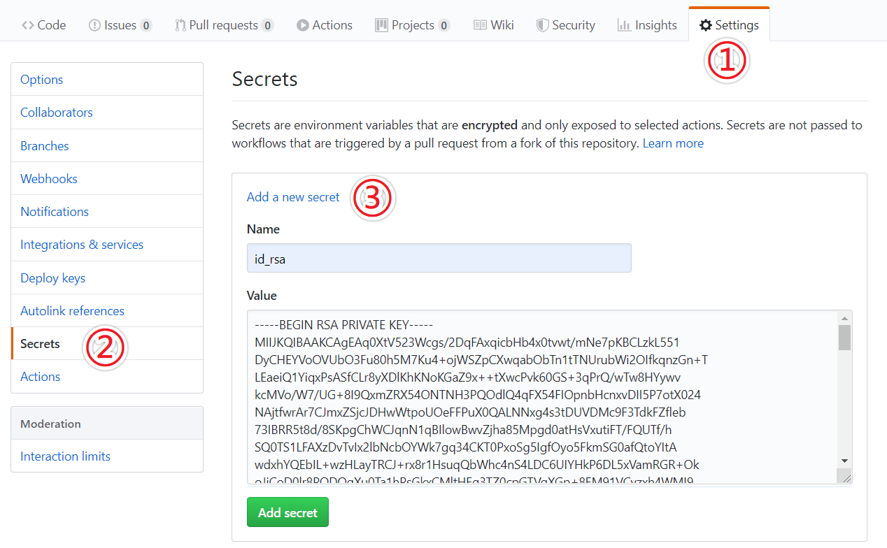如果存放 Hexo 源文件的仓库是公开的,为了不暴露私钥需要将之前生成的私钥保存到 Secrets 当中,需要时通过环境变量访问。