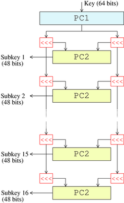 得到密钥的比特列表后需要使用 PC-1 生成两个 28 位半密钥(总共只使用了 56 位密钥,剩下的 8 位可以作为奇偶校验)。